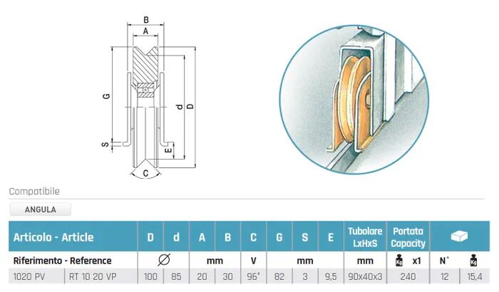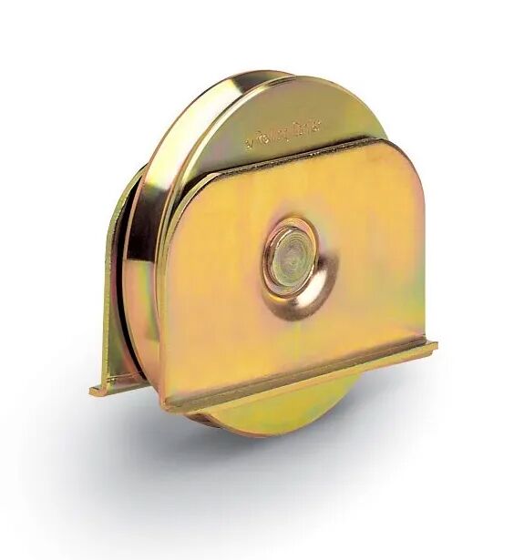 Italian high quality, 100mm V-groove recess mount (low profile) sliding gate wheel with outer support & one sealed bearing; load capacity of 240-kgs per wheel; compatible with our angular ‘V’ groove track; zinc plated gold; tested upto 1 million cycles.