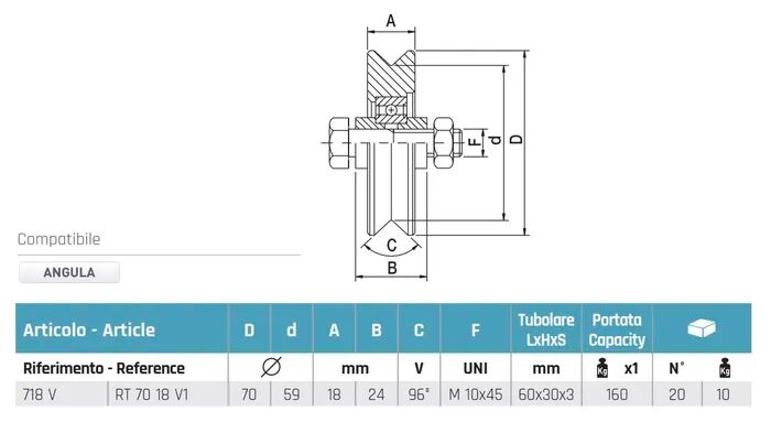 The 718 V single bearing sliding gate wheel includes a M10×45 UNI-compliant bolt (F), two spacers, and one securing nut, providing a complete bolt-thru assembly ready for installation. With a 70 mm wheel diameter (D), 59 mm internal bore (d), an 18 mm wheel width (A), and 24 mm base (B), this model is engineered for optimum strength and gate stability.